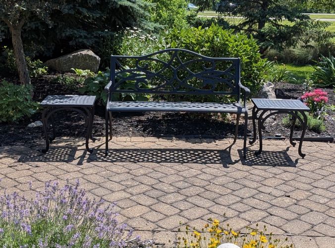 I don’t have a bench on my patio, but I have two comfortable chairs and the patio is surrounded by flowers. It is a perfect place for visits. Last night I video chatted with a friend in Canada who wanted to see lightning bugs, only she called them fireflies. It was a wonderful idea. After viewing the bugs, I sat in my chair and I could see her sitting in hers. We visited.