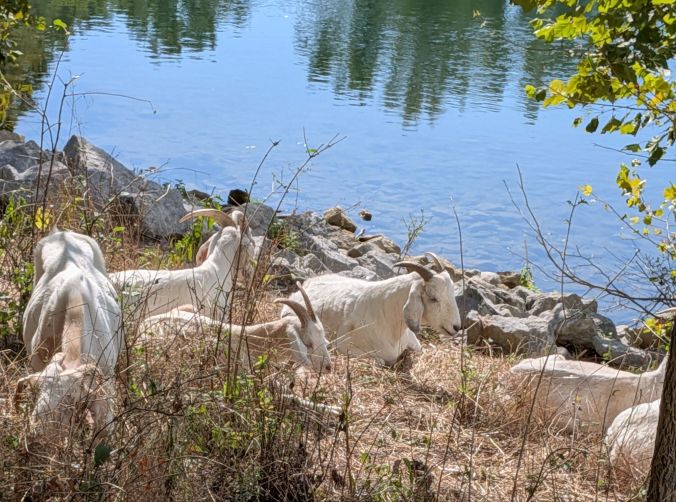 There are twenty goats enjoying poison ivy and other invasive plants. An electric fence protects them from people and dogs while a plastic fence a yard away protects people from the electric fence. The goats’ owners move the goats and fences every day or two and it appears to be a lot of work.