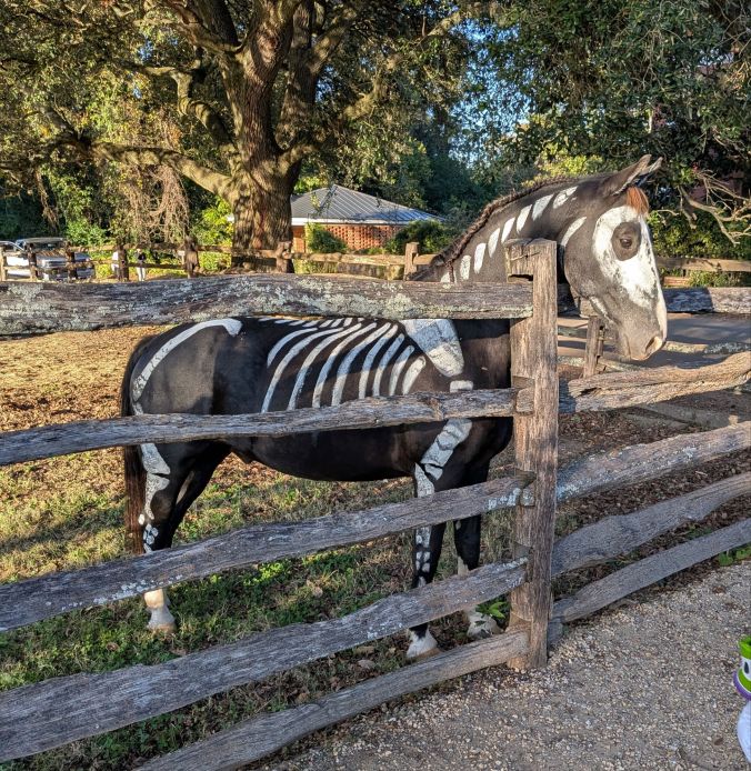 Halloween is a fun time to try a new look. This horse decided on being a skeleton. I understand last year he just wore a hat, but wanted to be more creative this year. I think it worked. I’ve been impressed by what I’ve seen the dogs in the neighborhood wearing. The witch costume is adorable, but I’m surprised the dog doesn’t knock the hat off.